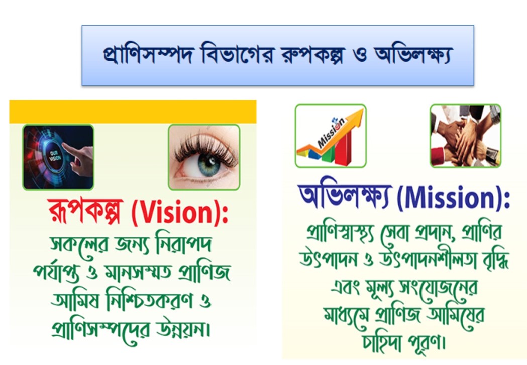 ভিশনঃ সকলের জন্য নিরাপদ, পর্যাপ্ত ও মানসম্মত প্রাণিজ আমিষ নিশ্চিতকরণ ও প্রাণিসম্পদের উন্নয়ণ।